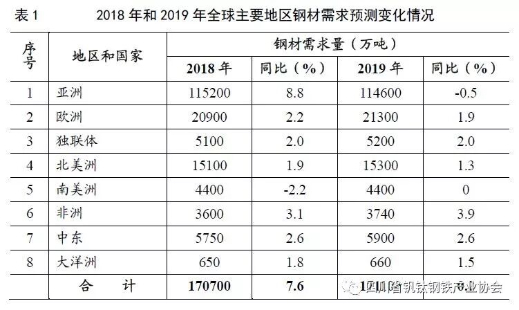 1. 亚洲地区:预测2018年和2019年亚洲钢材需求量分别为11.52亿吨和11.46亿吨,同比分别增长8.8%和下降0.5%。