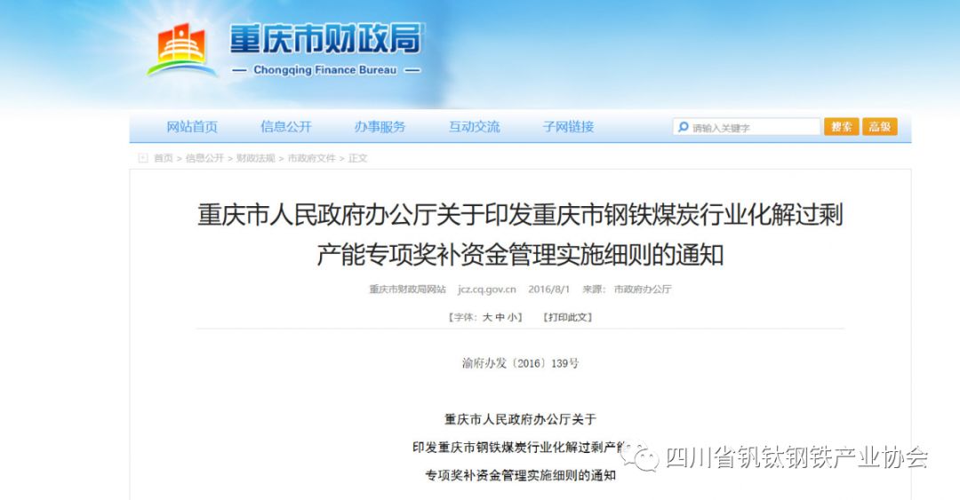 重庆市政府办公厅日前发布《重庆市钢铁煤炭行业化解过剩产能专项奖补资金管理实施细则》(以下简称《细则》),对于重庆市关闭过剩产能的煤矿厂区,按600万元/个进行包干奖补;对于钢铁行业化解过剩产能专项奖补资金,按70元/吨实行定额奖补。