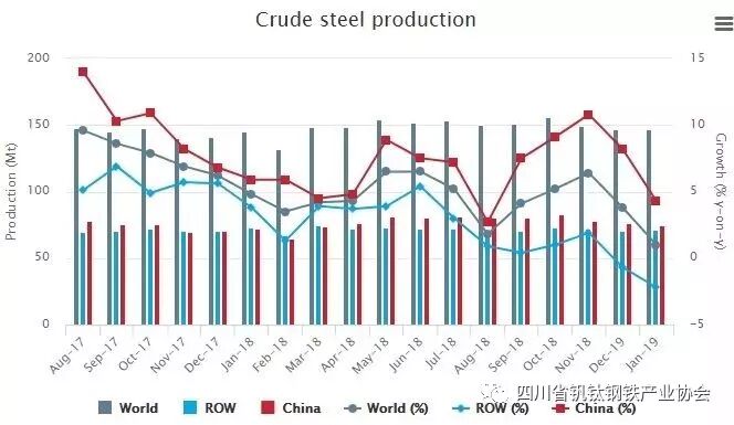 2019年1月份,全球64个纳入世界钢铁协会统计国家的粗钢产量为1.467亿吨,同比增长1%。