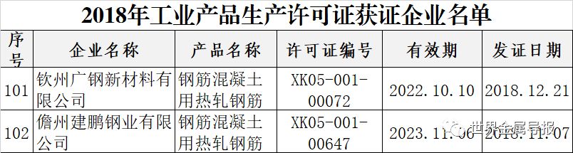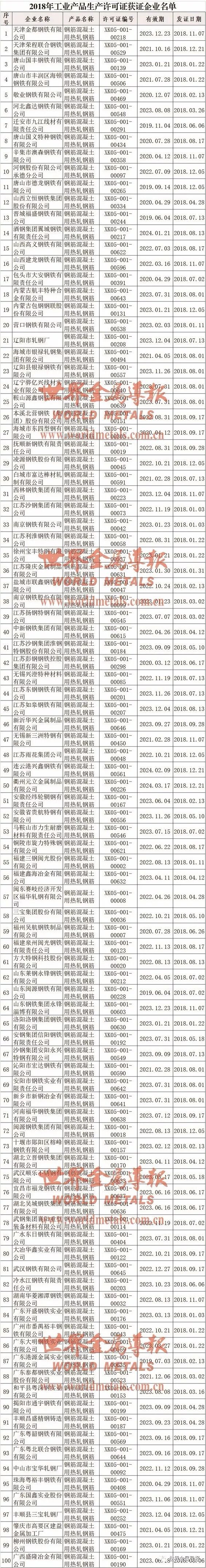近日,市场监管总局关于公布2018年工业产品生产许可证获证企业名单的公告,公告称,根据《中华人民共和国工业产品生产许可证管理条例》(国务院令第440号)及其实施办法(质检总局第156号),以及国务院《关于调整工业产品生产许可证管理目录和试行简化审批程序的决定》(国发〔2017〕34号)、《关于进一步压减工业产品生产许可证管理目录和简化审批程序的决定》(国发〔2018〕33号),公布2018年市场监管总局许可的3740家工业产品生产许可证获证企业名单,其中210家钢企获2018年钢筋混凝土用热轧钢筋、冷轧带肋钢筋、轴承钢钢材产品许可证。