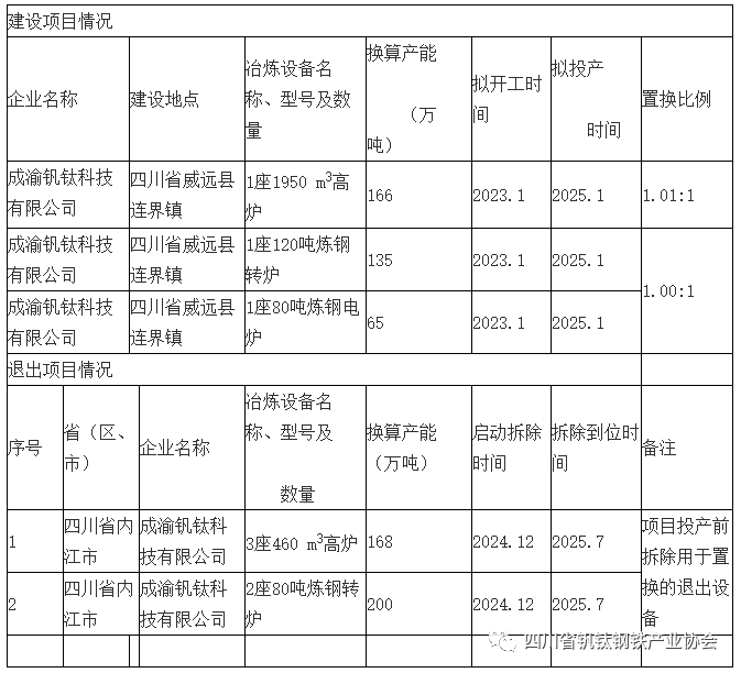 - 成渝钒钛科技有限公司3座460 m3高炉和2座80吨转炉钢铁产能置换方案已公示