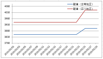 3月份钛渣行情基本稳定、开工状况逐步恢复,中下旬报价和成交价均有所回升。截至2019年3月29日,云南地区酸渣(TiO2≥74%)主流含税报价3800-3900元/吨,四川地区主流报价4000-4100元/吨;高钛渣(TiO2≥90%)主流含税报价5860-6050元/吨(图3,图4)