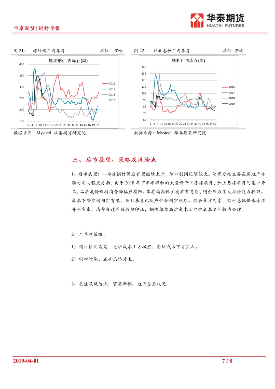 【供求】利润尚可、环保限产结束情况下二季度供应或会回升。政策方面影响逐步降低,利润下降才能推动钢企自发检修,表现在高炉添加废钢与电炉开工率下降,废钢价格向铁水靠拢。汽车、船舶、家电等方面对钢材消费则已转弱。二季度预期基建、工程机械仍将向好,地产消费转弱时间和程度则分歧较大。
