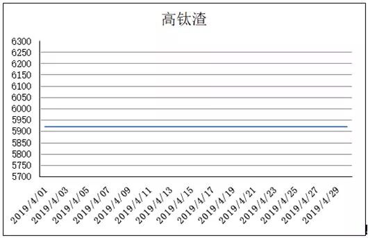 4月1日,佰利联宣布其公司旗下酸溶渣、酸溶渣细粉销售价格上调至4900元/吨,高钛渣销售价格上调至6800元/吨(出厂价);中信钛业高钛渣(TiO2≥90%)招标价格为5700元/吨(含税),由于降税,不含税价格4月份较3月份小幅上调约44元/吨;4月份国内酸溶渣行业开工率约35%,产量约3.8万吨,国内高钛渣行业开工率约24%,产量约1.8万吨。综合降税因素,4月份高钛渣行情总体来看稍有回暖,酸渣行情基本持稳运行。截至2019年4月30日,云南地区酸渣(TiO2≥74%)主流含税报价约3800元/吨,四川地区主流报价约4000元/吨;高钛渣(TiO2≥90%)主流含税报价5800-6000元/吨(图3,图4)。