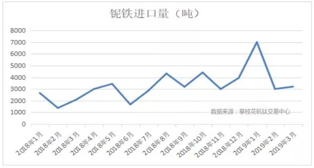 2018年1月到2019年3月,中国铌铁进口总量49119.051吨,总金额68.93亿元,主要进口国为巴西。2019年一季度进口13210.43吨,同比2018年一季度增加7113.33吨,同比上升116.67%。
