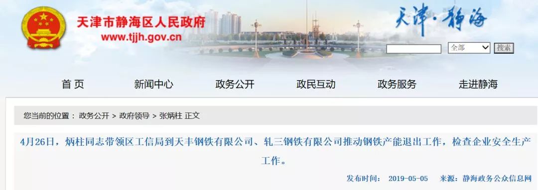 近期的公开信息,也印证了上述推断。据天津市静海政务公众信息网消息,4月26日,天津市静海区副区长张炳柱同志带领区工信局到天丰钢铁有限公司、轧三钢铁有限公司推动钢铁产能退出工作,检查企业安全生产工作。而根据天津市北辰区印发的北辰区2019年打好污染防治攻坚战七个作战计划的通知,2019年天津市北辰区要着力破解“钢铁围城”问题,督促天津市天重江天重工有限公司委托第三方机构开展现状调查,指导制定清产核资实施方案、职工安置实施方案、债权债务处置实施方案、土地处置实施方案、冶炼设备封停及拆除安全监管实施方案等。