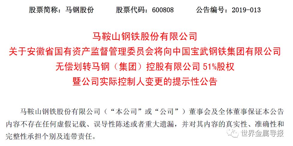 6月2日,马钢股份发布《关于安徽省国有资产监督管理委员会将向中国宝武钢铁集团有限公司无偿划转马钢(集团)控股有限公司51%股权暨公司实际控制人变更的提示性公告》(下简称《公告》),《公告》发布以下三项重要内容: