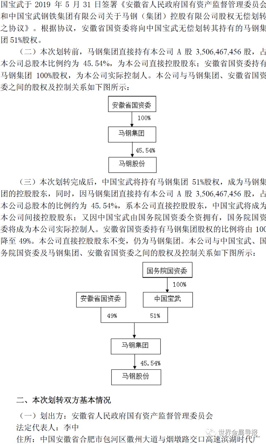 1、安徽省国资委将马钢集团51%的股权无偿划转给中国宝武。