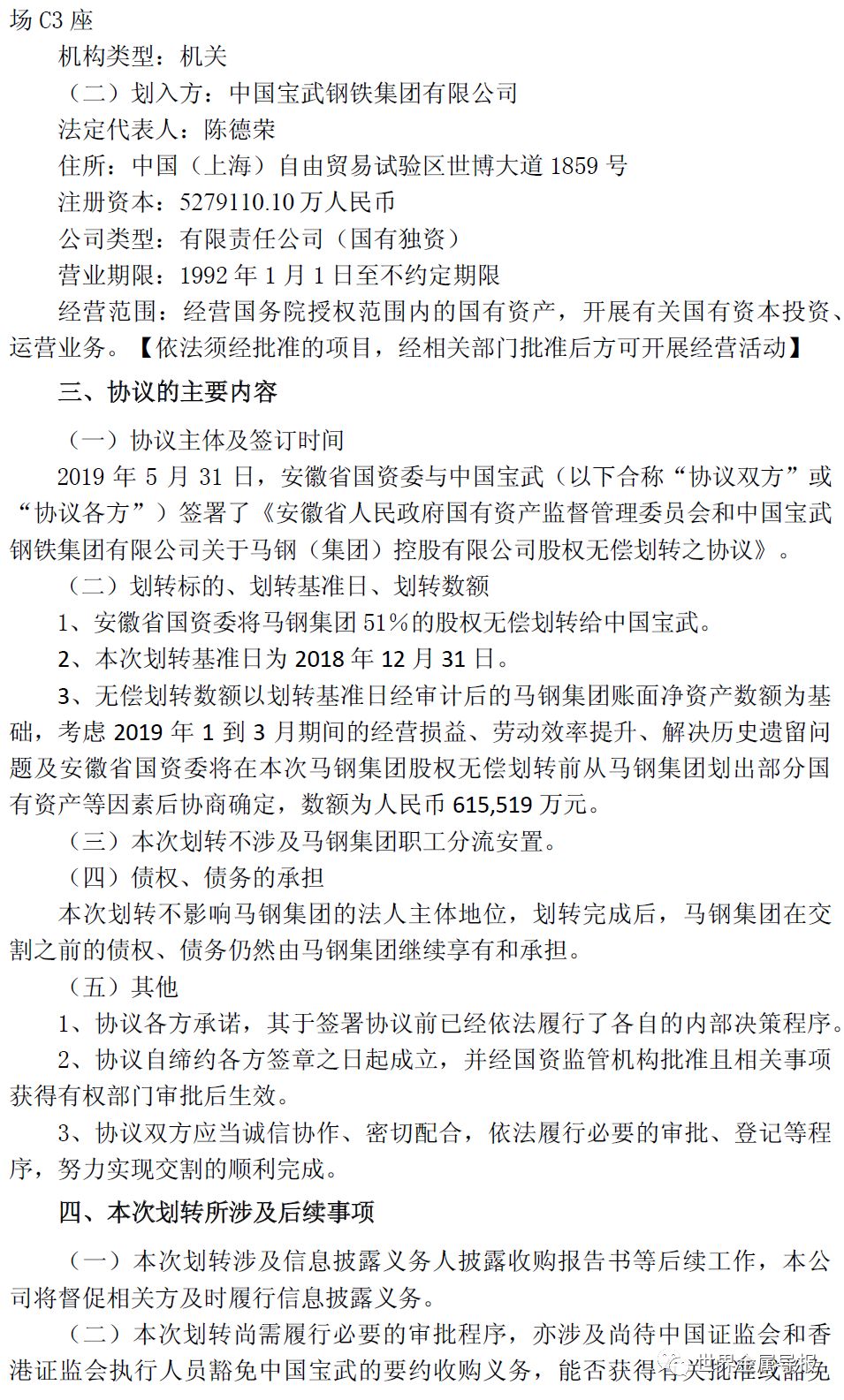 2019年5月31日,安徽省国资委与中国宝武(以下合称“协议双方”或“协议各方”)签署了《安徽省人民政府国有资产监督管理委员会和中国宝武钢铁集团有限公司关于马钢(集团)控股有限公司股权无偿划转之协议》。