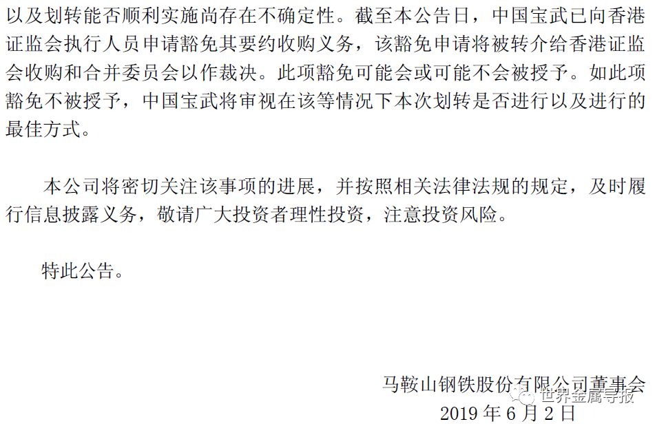 3、本次划转尚需履行必要的审批程序,亦涉及尚待中国证券监督管理委员会(以下简称“中国证监会”)、香港证券及期货事务监察委员会(以下简称“香港证监会”)豁免中国宝武的要约收购义务,能否获得有关批准或豁免以及划转能否顺利实施尚存在不确定性。截至本公告日,中国宝武已向香港证监会执行人员(指香港证监会企业融资部执行董事或任何获其转授权力的人)(以下简称“香港证监会执行人员”)申请豁免其要约收购义务,该豁免申请将被转介给香港证监会收购和合并委员会以作裁决。此项豁免可能会或可能不会被授予。如此项豁免不被授予,中国宝武将审视在该等情况下本次划转是否进行以及进行的最佳方式。