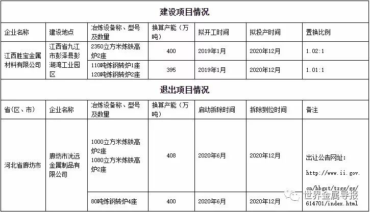 2018年12月5日,江西工信厅发布《廊坊市洸远金属制品有限公司钢铁产能跨区域转移拟建江西胜宝金属材料有限公司项目产能置换方案公告 》,公告称,廊坊市洸远金属制品有限公司淘汰1000立方米炼铁高炉2座和1080立方米炼铁高炉2座(炼铁产能408万吨)以及80吨炼钢转炉4座(炼钢产能400万吨)用于在江西省九江市彭泽县彭湖湾工业园区新建2350立方米炼铁高炉2座(炼铁产能400万吨)、110吨炼钢转炉1座和120吨炼钢转炉2座(炼钢产能395万吨),计划于2019年1月开工,2020年12月投产。具体方案如下: