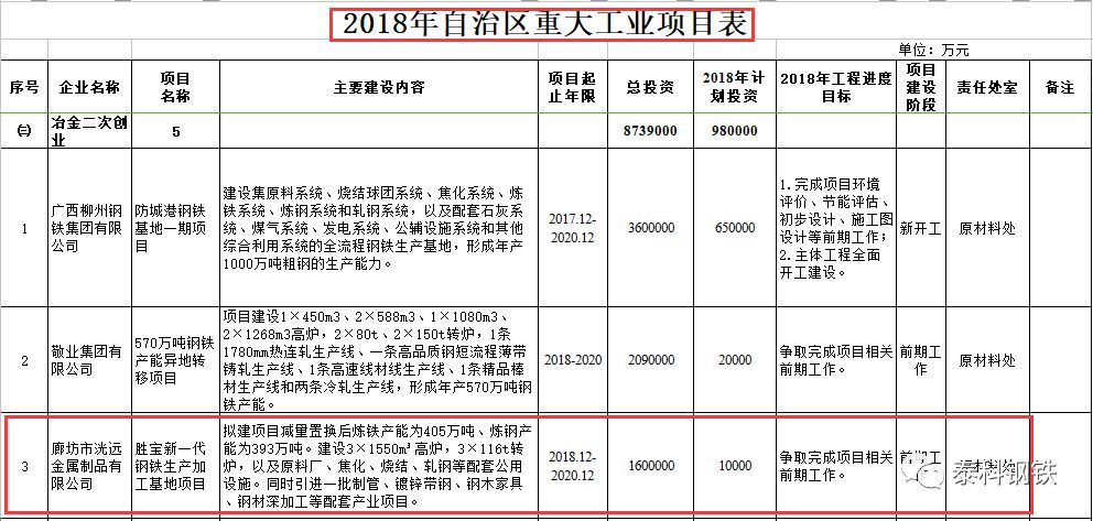 2018年6月,广西壮族自治区工业和信息化委发布《自治区工业和信息化委关于印发2018年自治区重点工业项目分级协调工作方案的通知》,同时附上了《2018年自治区重大工业项目表》,内容显示,来自河北廊坊市的洸远金属制品有限公司拟在广西北海市建设400万吨级钢厂“胜宝新一代钢铁生产加工基地项目”,总投资达160亿!不过该项目目前仍然处于“前期工作”阶段!也就是说,项目落地仍然存在不确定性。