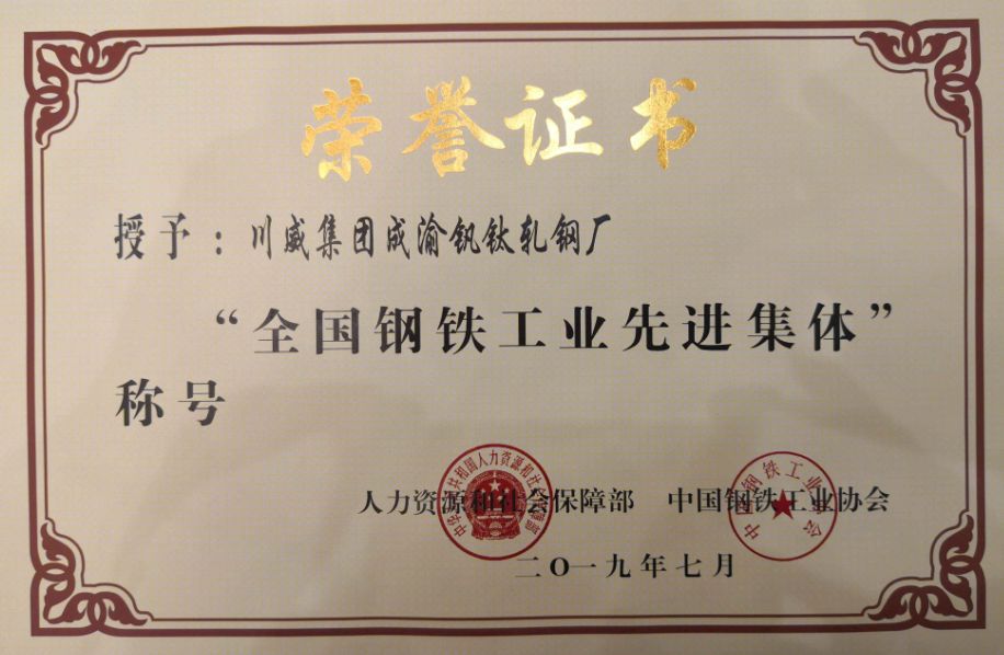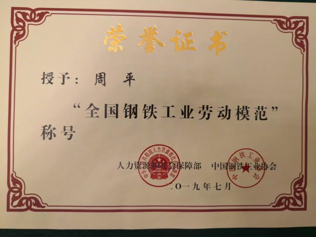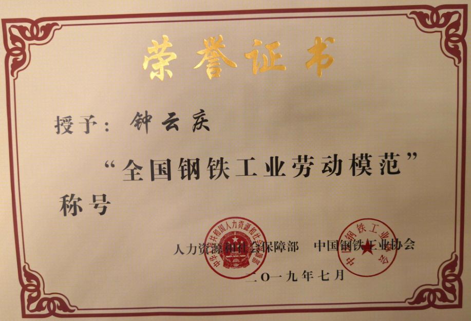 根据《人力资源和社会保障部、中国钢铁工业协会关于表彰全国钢铁工业先进集体劳动模范和先进工作者的决定》(人社部发【2019】75号),授予了97个单位“全国钢铁工业先进集体”称号、 96名同志“全国钢铁工业劳动模范”称号、 4名同志“全国钢铁工业先进工作者”称号。