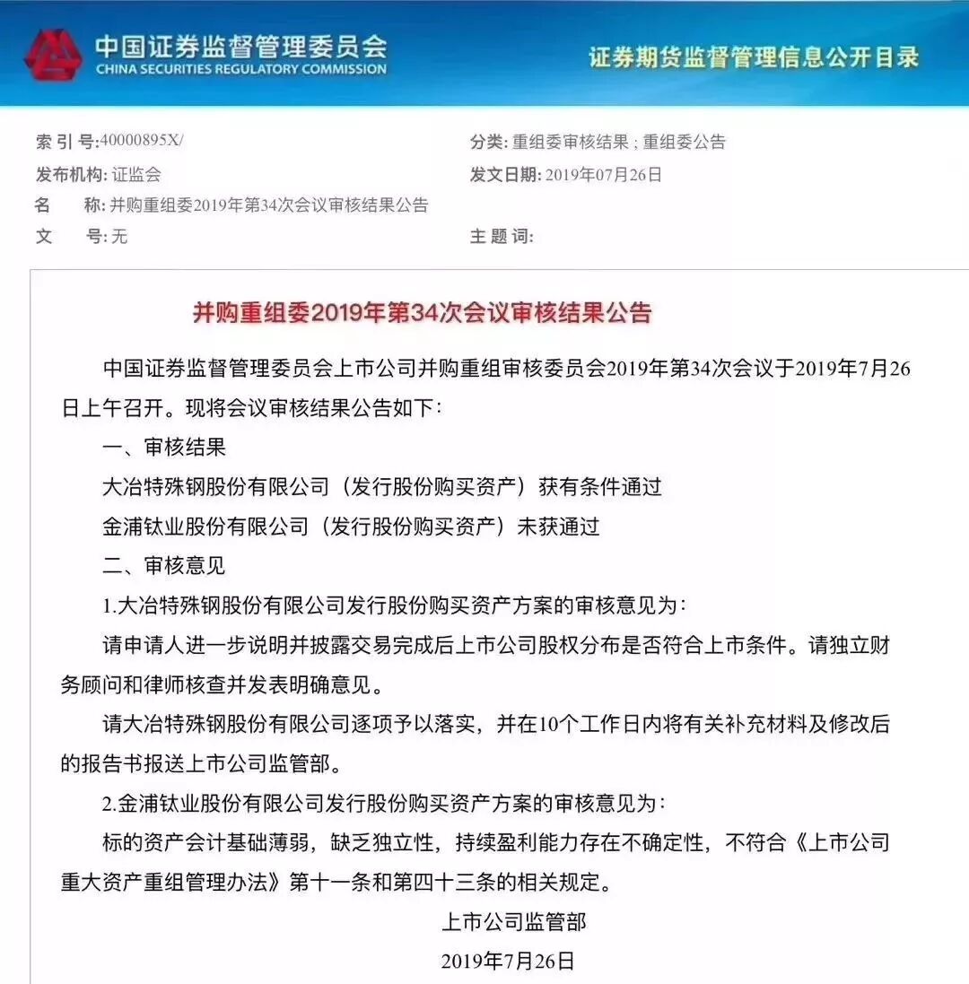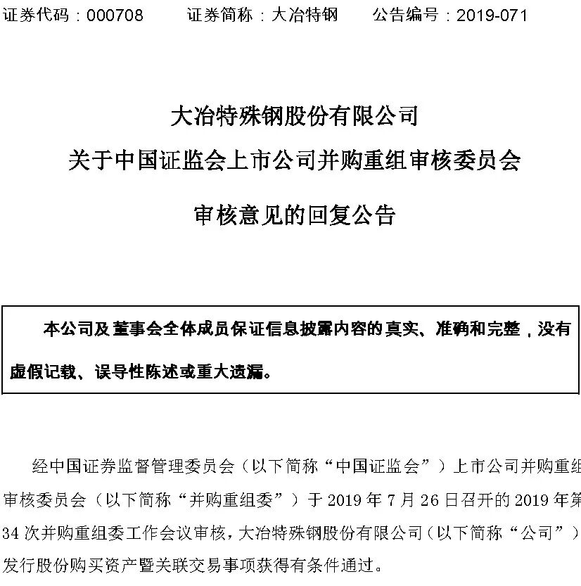 7月31日,大冶特殊钢股份有限公司发布《关于中国证监会上市公司并购重组审核委员会审核意见的回复公告》(下简称:《公告》),《公告》称,经中国证券监督管理委员会(以下简称“中国证监会”)上市公司并购重组审核委员会(以下简称“并购重组委”)于 2019 年 7 月 26 日召开的 2019 年第34 次并购重组委工作会议审核,大冶特殊钢股份有限公司(以下简称“公司”)发行股份购买资产暨关联交易事项获得有条件通过。