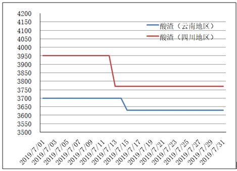 据不完全统计,7月份酸渣产量约3.36万吨,高钛渣产量约2.12万吨。中信钛业高钛渣(TiO2≥90%)招标价格为6000元/吨(含税),环比6月上涨1400元/吨。由于氯化钛白粉、海绵钛等行业对高钛渣需求较好,7月份高钛渣价格稳中有涨;7月份酸渣市场在钛白粉市场不景气的影响下弱势运行,同时由于执行丰水期电价,电力成本降低,攀枝花地区酸渣价格(均价)7月末较6月份末下调约150元,云南地区下调近100元/吨。截至7月末,云南地区酸渣(TiO2≥74%)主流含税报价约3550-3650元/吨,四川地区主流报价3700-3800元/吨;高钛渣(TiO2≥90%)主流含税报价5950-6200元/吨(图5,图6)。