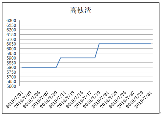 7月份,进口钛精矿价格稳中部分有涨,国产钛矿市场弱势运行;钛白粉市场传统淡季,实际成交价格在不断探底后开始企稳,后市有望些许反弹;钒系产品原料紧缺,厂商寻货积极,钒产品大幅上涨.截至7月最后一个交易日,攀枝花钒钛交易中心挂牌交易的2019年8月份交货的攀枝花钛精矿(商品代码“攀枝花钛精矿1908”)挂牌成交加权平均价每吨含税1340元、钛扁锭(商品代码“钛锭1908”)挂牌成交加权平均价每10公斤922元。