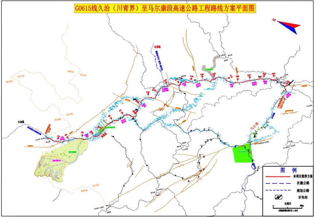 项目起点为青海省久治县川青边界处的甲尔多乡扎隆,北接G0615线青海段,途经德格互通、阿坝互通、查理寺互通、龙日坝互通、中埌口互通、刷经寺互通、王家寨枢纽互通,终点为马尔康市王家寨。