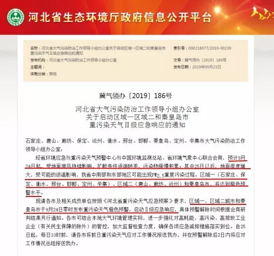 9月23日,河北省生态环境厅发布了《关于启动区域一区域二和秦皇岛市重污染天气Ⅱ级应急响应》的通知称,预计9月24日起,扩散条件逐渐转差,污染物缓慢积累;其中25日以后,中南部和东部地区可能出现PM2.5重度污染过程。区域一(石家庄、保定、衡水、邢台、邯郸、定州、辛集)、区域二(唐山、廊坊、沧州)和秦皇岛市,将达到橙色预警水平。按照《河北省重污染天气应急预案》要求,区域一、区域二城市和秦皇岛市于9月24日零时发布重污染天气橙色预警,启动Ⅱ级应急响应。