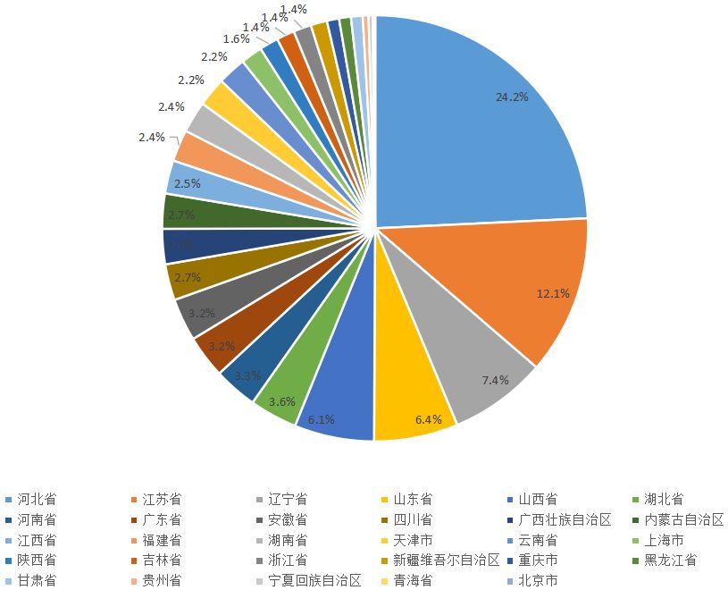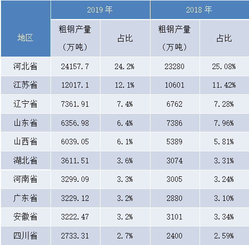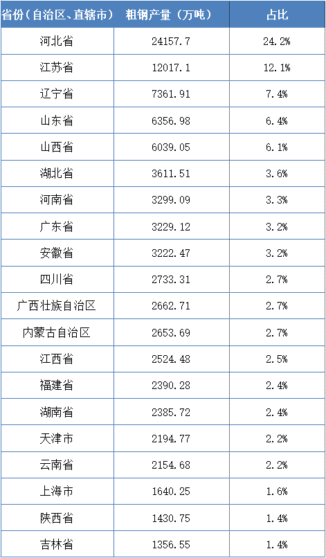 国家统计局数据显示,2019年我国31个省市自治区中,河北粗钢产量为24157.7万吨,占全国总量的24.2%,位居榜首。有3个地区无钢铁,分别是海南、西藏自治区(无统计)、北京(粗钢产量为0)。