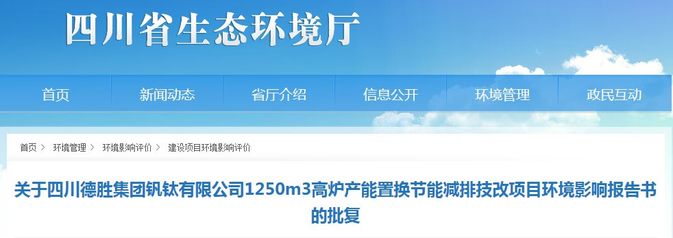 四川德胜1250m³高炉产能置换节能减排技改项目获批