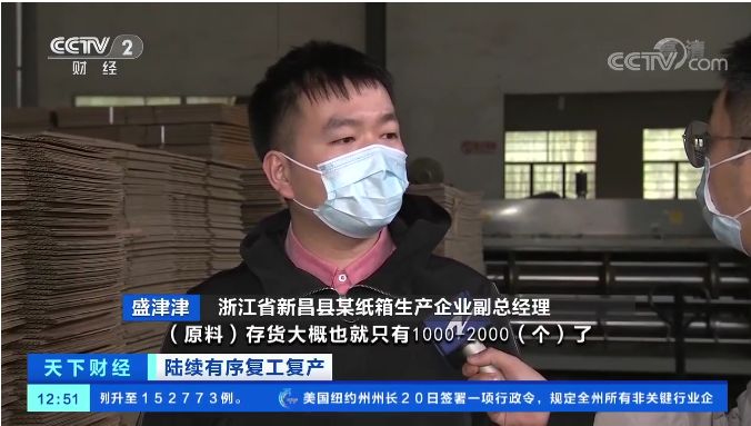 浙江省新昌县某纸箱生产企业副总经理 盛津津:(原料)存货大概也就只有1000-2000(个)了,没有这个东西的话,我们企业就没法生产了。