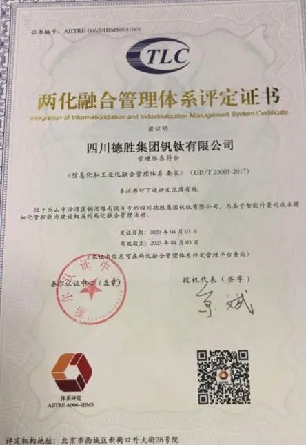 4月21日,德胜钒钛公司顺利通过国家工业和信息化部《信息化和工业化融合管理体系要求》(GB/T 23001-2017)体系认证,获得两化融合管理体系评定证书。两化融合贯标的认证,使公司在转型升级、智能制造、信息化建设和创新创业试点示范项目中能优先获得国家工信部和省市项目资金支持,标志着公司信息化建设水平迈上新的台阶。