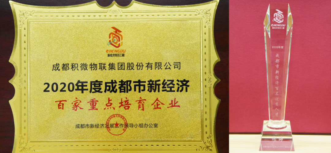 积微物联入选2020年成都市新经济百家重点培育企业,积微物联总裁谢海入选2020年成都市新经济百名优秀人才。