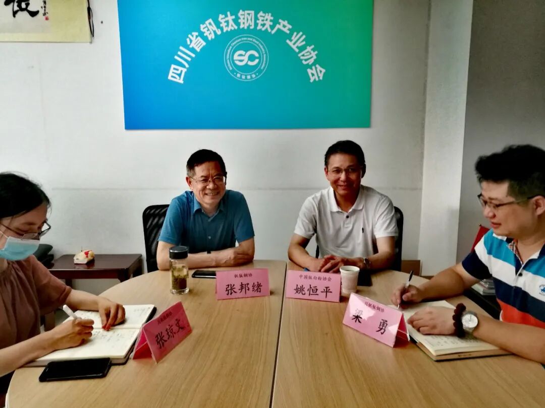 7月28日下午,中国涂料工业协会钛白粉分会秘书长姚恒平莅临我会,就2020首届中国钛业攀西论坛筹备相关事宜与我会常务副会长兼秘书长张邦绪、秘书长助理兼钒钛部部长梁勇、钒钛部张琼文等进行了交流。