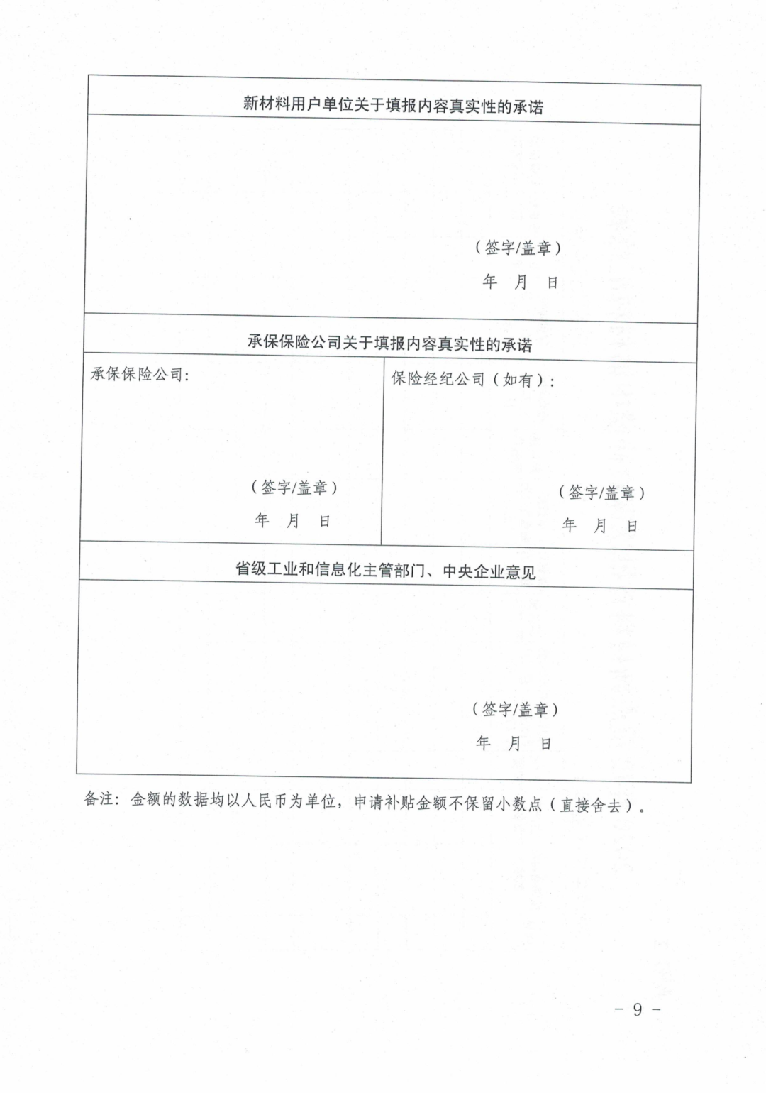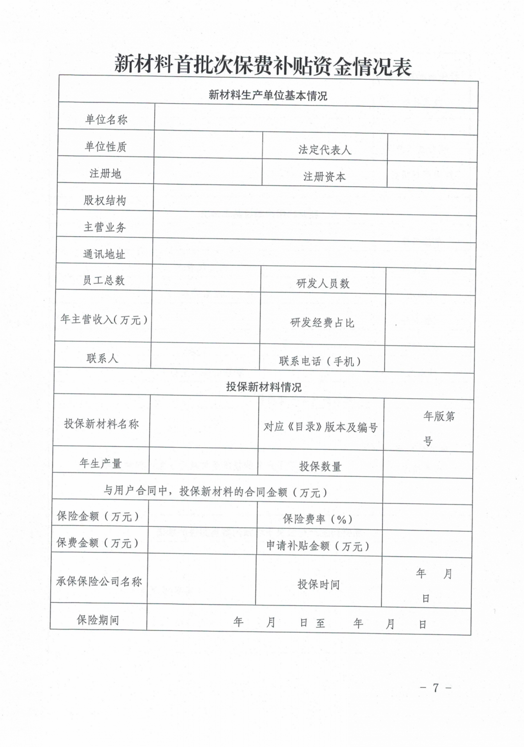 7、对申报材料的要求。新材料首批次保费补贴资金情况表;企业营业执照或事业单位法人证书副本复印件;首批次新材料生产企业和用户单位所签订的正规合同;保单及保险费发票复印件;省级以上产品质量管理部门认可机构、中国新材料测试评价联盟检测机构成员或用户企业认可的第三方产品检测报告;产品专利、专利授权书或其他关于知识产权的承诺;其他需要补充的有关证明材料等。