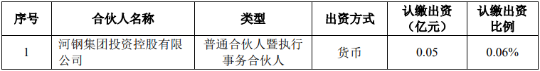 其中合伙人认缴出资情况如下:河钢集团投资控股有限公司出资0.05亿元(执行事务合伙人),建信金投基金管理(天津)有限公司出资0.01亿元,建信金融资产投资管理有限公司(有限合伙)出资24.99亿元,河北钢铁产业转型升级母基金(有限合伙)出资59.95亿元。该基金主要从事对未上市企业的投资,对上市公司非公开发行股票的投资及相关咨询服务(依法须经批准的项目,经相关部门批准后方可开展经营活动)。