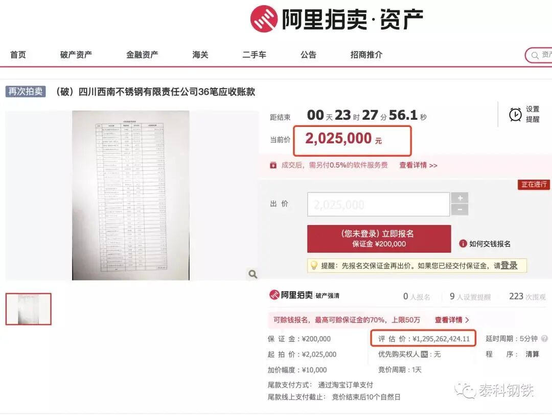 起拍价仅202.5万!西南不锈钢破产12.95亿应收账款今天公开拍卖!
