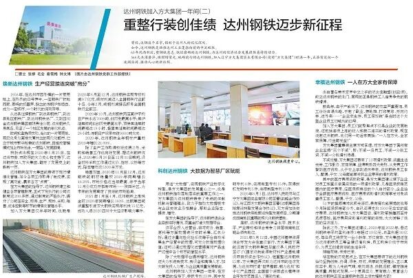 2020年10月,达州钢铁两座高炉平均日产铁水达7009吨,创历史最高水平;焦炉结焦时间也创历史最高水平,顶装焦结焦时间最短达19小时,捣固焦结焦时间最短达26小时;炼钢日产纪录突破9000吨大关。