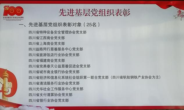 四川省经济和信息化系统社会组织第一联合党支部(四川省钒钛钢铁产业协会为主) 由党支部书记张邦绪带队参会。根据《中共四川省社会组织第二综合委员会关于表彰先进基层党组织、优秀党员和优秀党务工作者的决定》,我支部不仅荣获“先进基层党组织”称号,党员李婷婷同志还荣获优秀党务工作者代表、党员张琼文同志荣获优秀共产党员表彰。