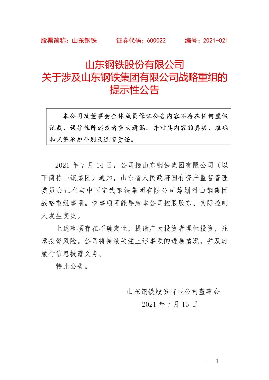 7月14日晚间,山东钢铁(600102.SH)公告称,山东省国资委正在与中国宝武钢铁集团有限公司(下称中国宝武)筹划对山东钢铁集团战略重组事项。山东钢铁集团为山东钢铁的控股股东,此次重组可能导致山东钢铁的控股股东发生变更。