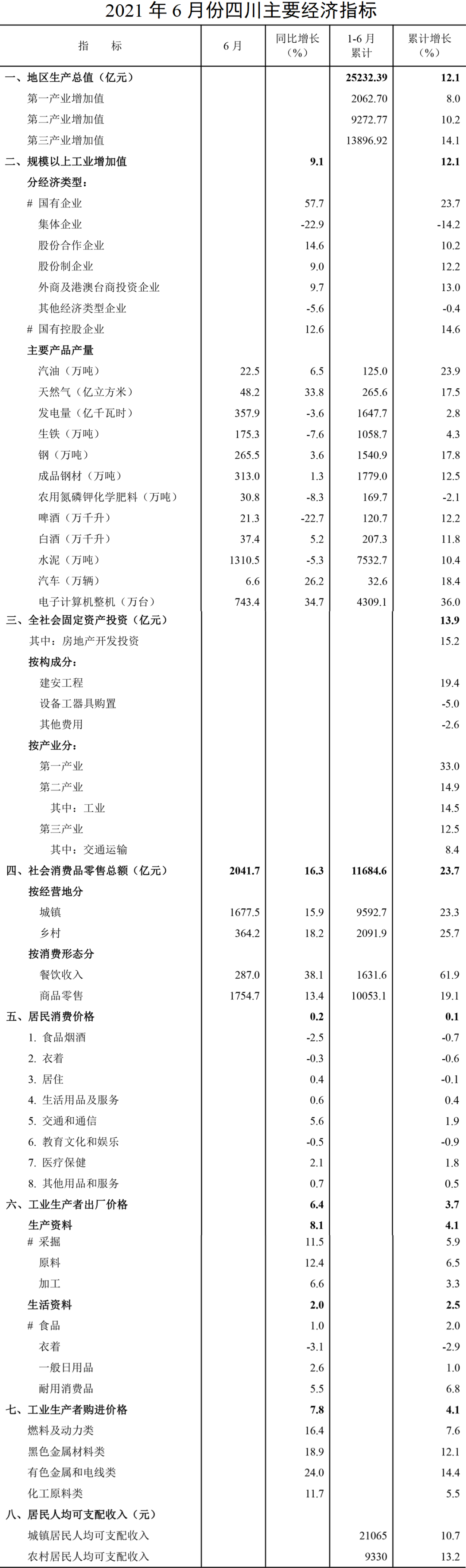根据地区生产总值统一核算结果,2021年上半年全省地区生产总值为25232.39亿元,同比增长12.1%,两年平均增长6.2%。其中,第一产业增加值2062.70亿元,同比增长8.0%,两年平均增长4.6%;第二产业增加值9272.77亿元,同比增长10.2%,两年平均增长5.8%;第三产业增加值13896.92亿元,同比增长14.1%,两年平均增长6.6%。