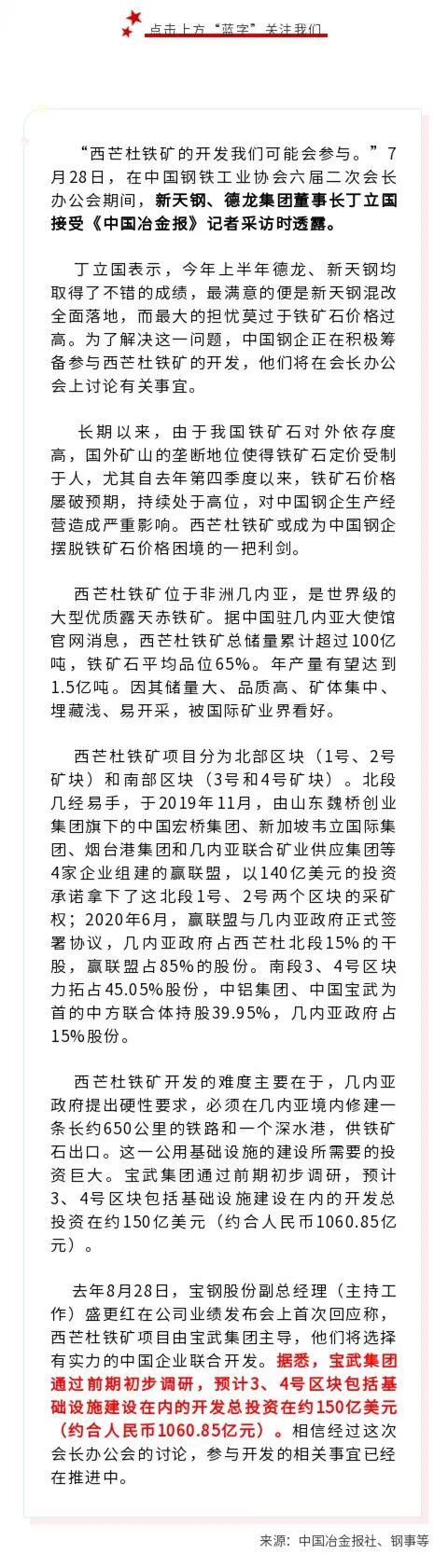 新天钢、德龙集团董事长丁立国透露可能参与西芒杜铁矿的开发