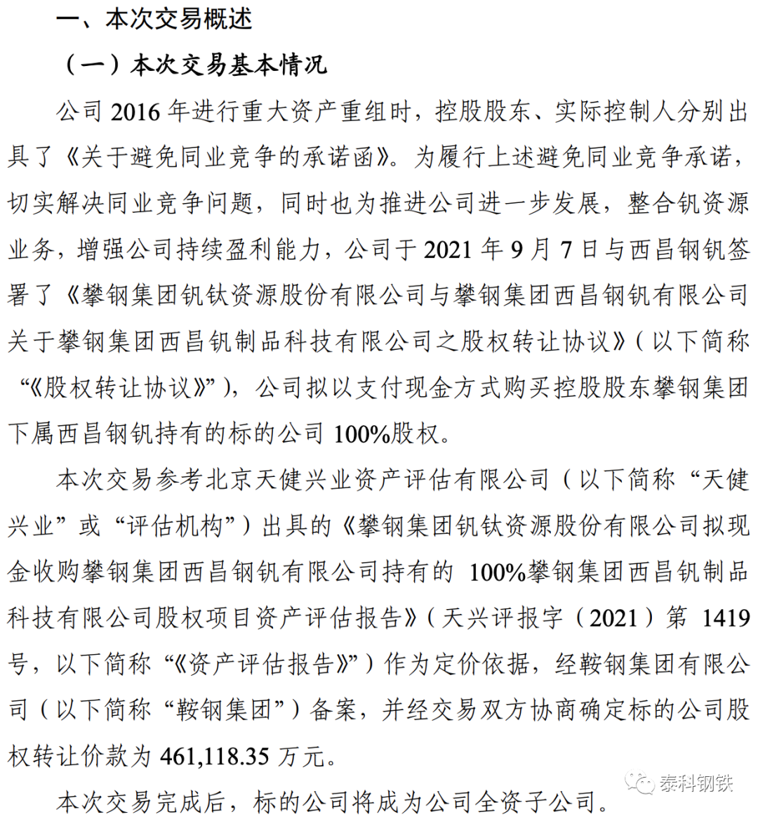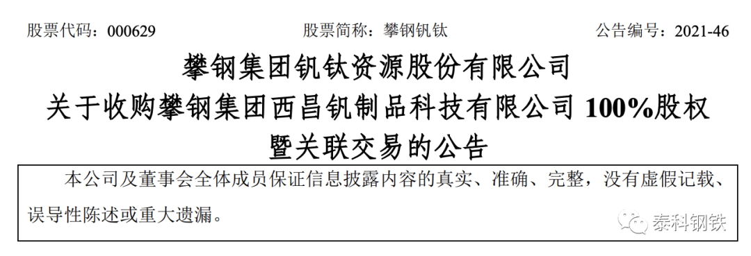 46.11亿!攀钢钒钛收购西昌钢钒100%股权!