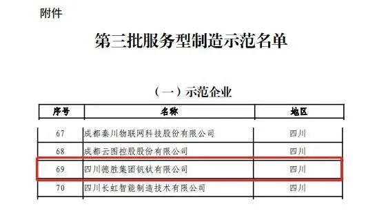 热烈祝贺德胜钒钛入选第三批国家级服务型制造示范名单