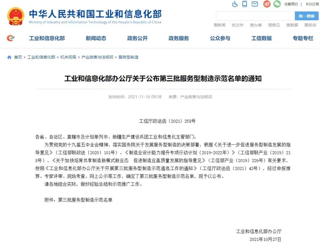 服务型制造,是制造与服务融合发展的新型产业形态,是制造业转型升级的重要方向。工信部于2017年开始在全国范围内开展首批国家级服务型制造示范企业、项目和平台的认定,遴选聚焦供应链管理、产品全生命周期管理、总集成总承包服务和信息增值服务等领域。通过服务型制造示范企业和平台的评选,推动企业生产经营重心从制造环节向制造和服务环节并重转变,引导制造企业与产业链上下游企业融合,与互联网企业和信息技术服务企业融合,通过创新加快转型。