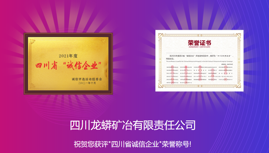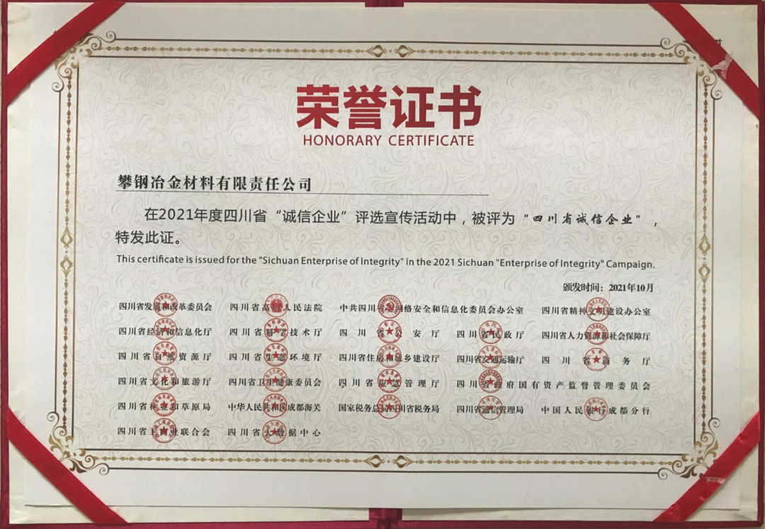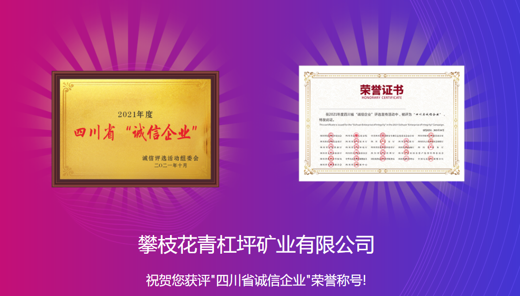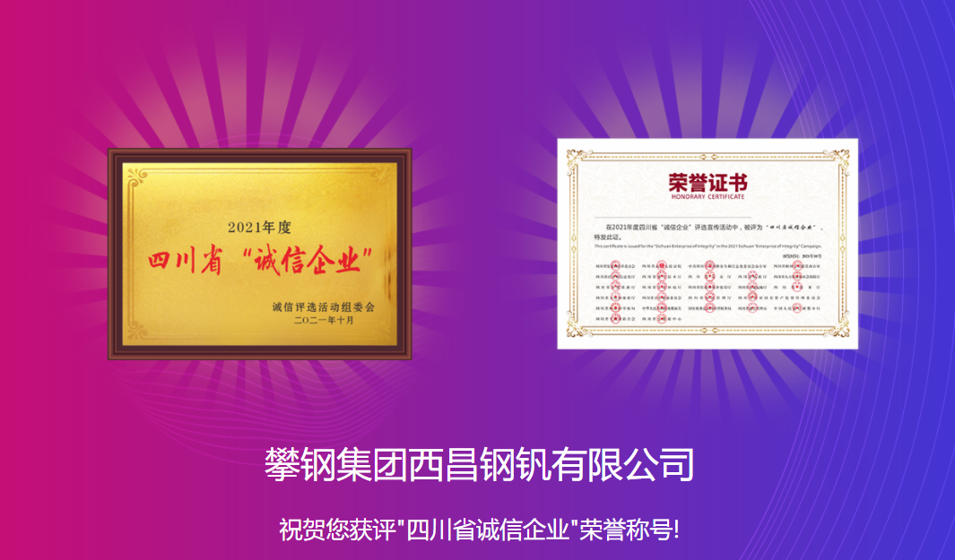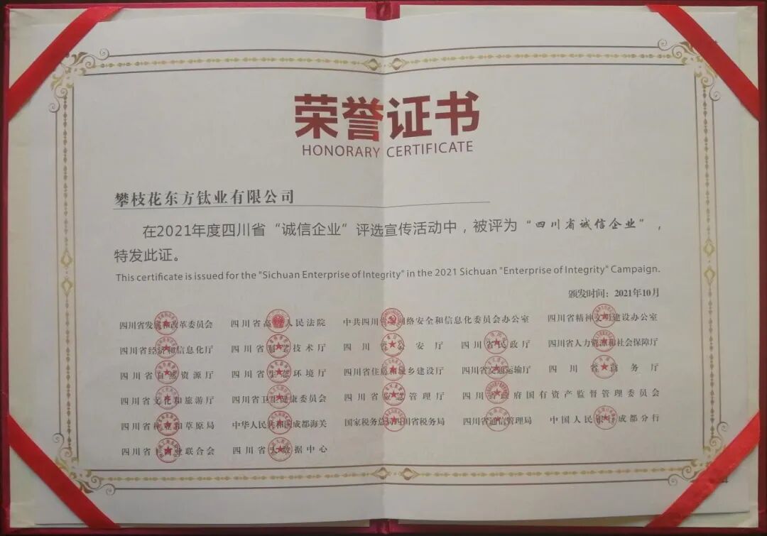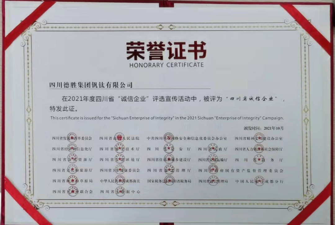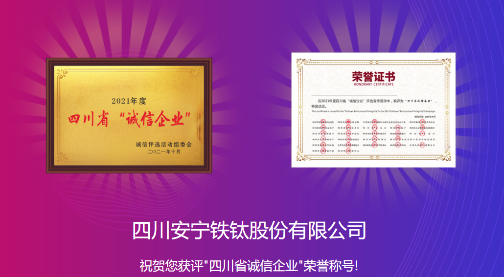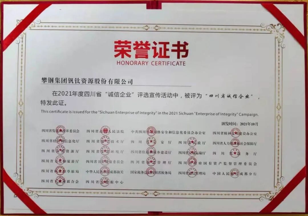 近日,由四川省发展和改革委员会等25部门联合开展的2021年四川省“诚信企业家”及“诚信企业”评选活动中,我会会员:攀钢集团钒钛资源股份有限公司、四川德胜集团钒钛有限公司、攀钢集团西昌钢钒有限公司、攀钢冶金材料有限责任公司、攀枝花东方钛业有限公司、四川龙蟒矿冶有限责任公司、四川安宁铁钛股份有限公司、攀枝花青杠坪矿业有限公司被评为了2021年度四川省“诚信企业”。