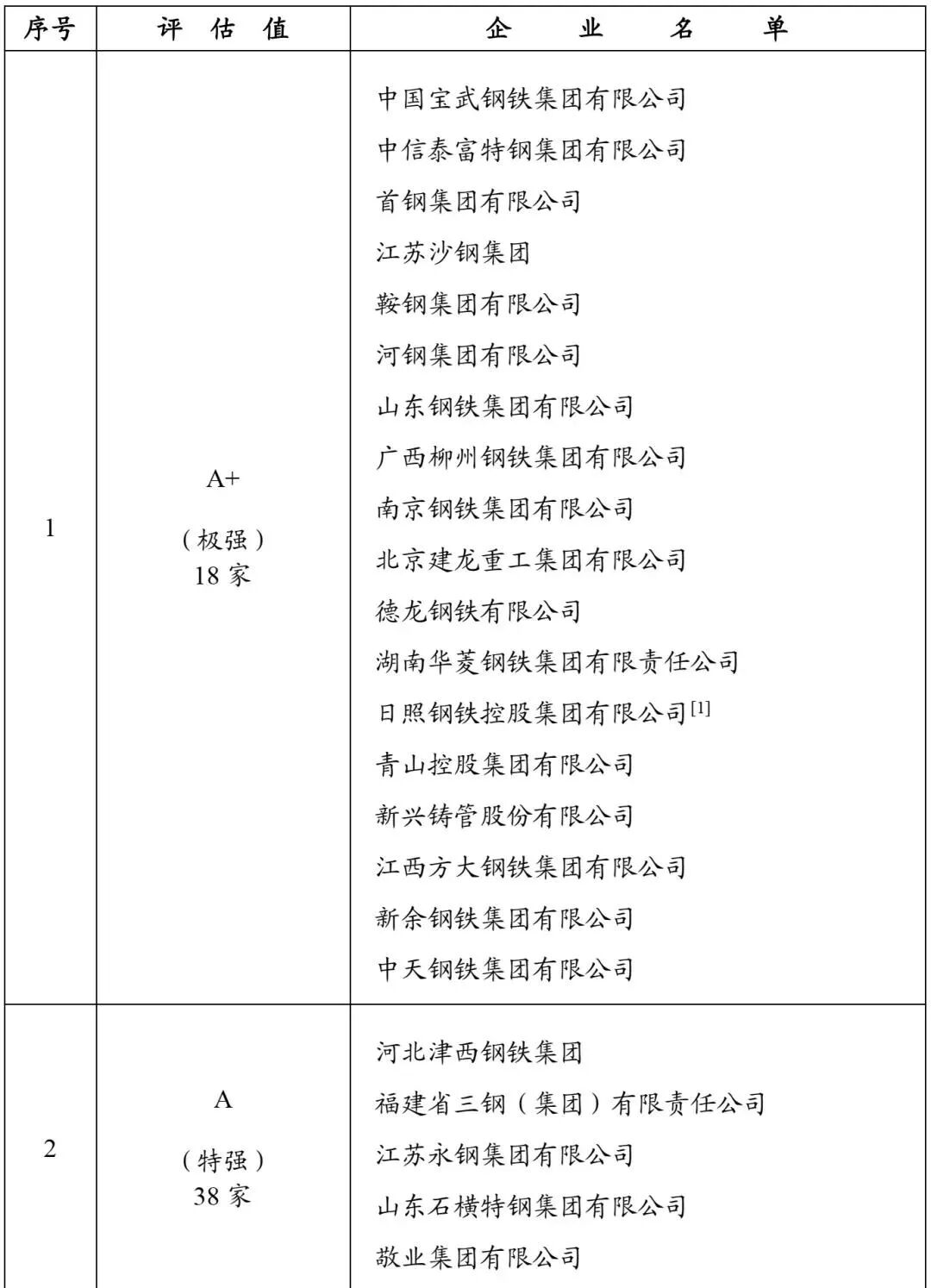 据悉,本次参与钢铁企业竞争力(暨发展质量)评级的对象,包括国内大多数重点统计钢铁企业,吸纳了部分其他钢铁企业,共有122家钢铁企业进入本次评估范围,合计粗钢产量约占全国总产量的90.2%。进入评级A+、A、B+的钢铁企业共有92家,占评估钢铁企业总家数的75.4%,合计粗钢产量占全国总产量的86.3%。