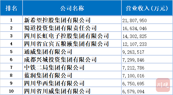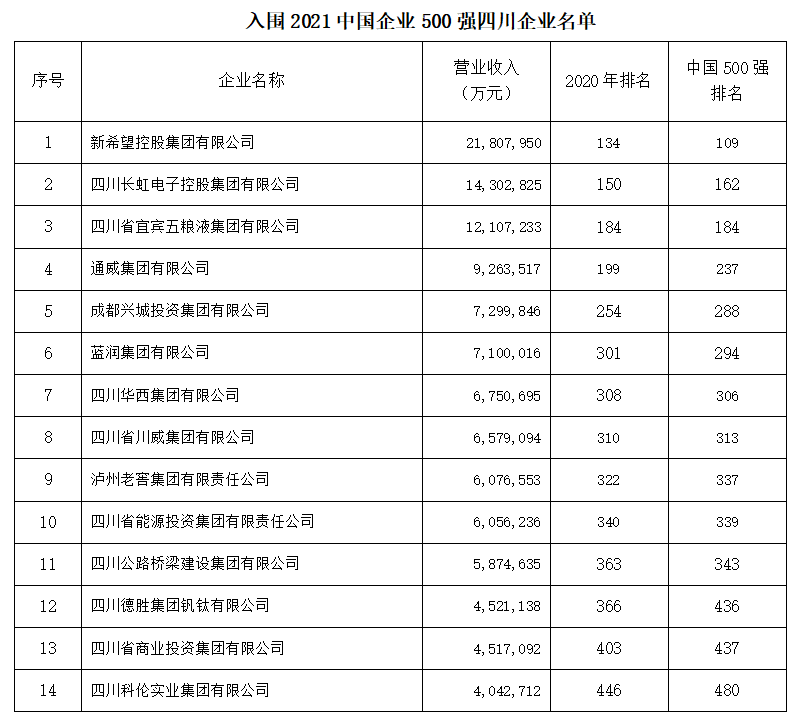 2021年四川有14家四川企业入围中国企业500强,较上年减少1家。新希望控股集团有限公司以21,807,950万元的营收成为进入中国500强的四川企业首位,总排名109位,比去年上升25位。其余入围企业名单如下。
