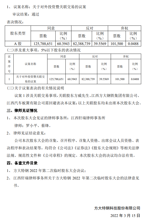 方大特钢在2022年第二次临时股东大会决议公告中称,对外投资议案涉及关联交易事项,关联股东方威、江西方大钢铁集团有限公司、江西汽车板簧有限公司需回避表决本议案;以上关联股东均未出席本次股东大会。