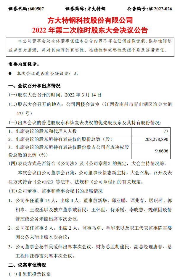 3月14日,方大特钢(600507,SH)召开2022年第二次临时股东大会,距3月10日召开的2022年第一次临时股东大会相隔仅4天。