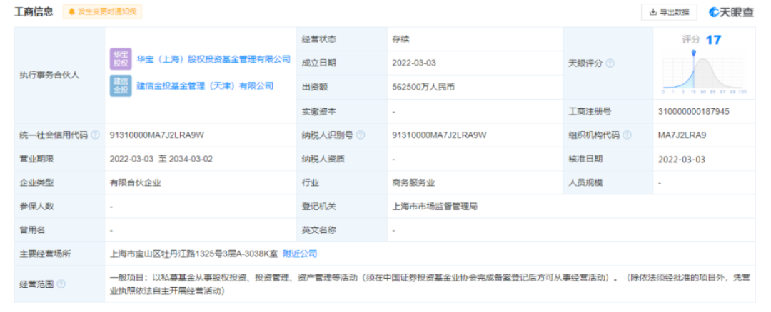 天眼查工商信息显示,基金由中国宝武钢铁集团有限公司出资29.99亿;建信金融资产投资有限公司出资11.24亿;国家绿色发展基金股份有限公司出资9.99亿元;上海宝恒经济发展有限公司出资5亿元;建信金投基金管理(天津)有限公司、绿色发展基金私募股权投资管理(上海)有限公司、华宝(上海)股权投资基金管理有限公司各出资100万元。