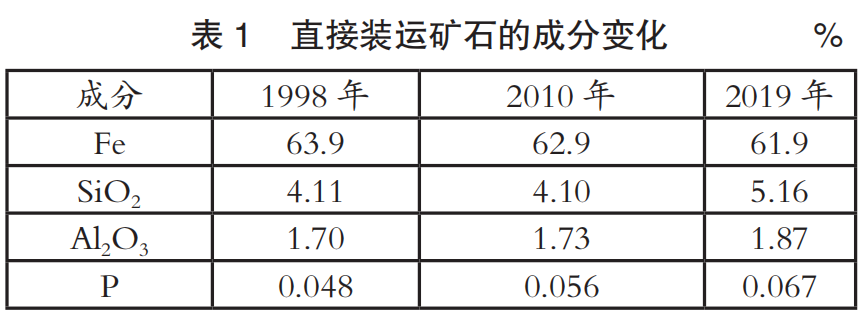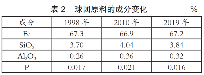 表2显示了1998年、2010年和2019年主要球团原料的Fe、SiO2、Al2O3和P含量。从整体质量来看,已经发生了很大变化,主要是因为选矿技术和造块技术的改变或提升。
