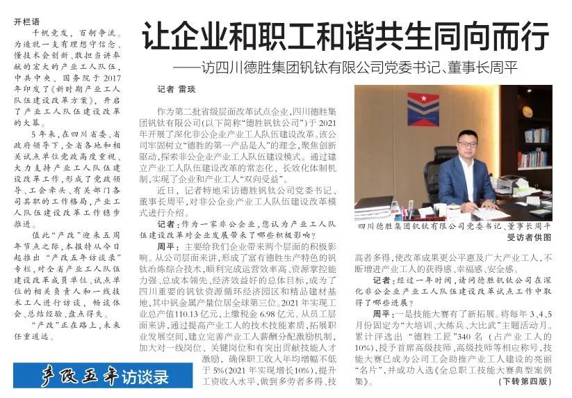 四川工人日报从4月16日起推出“产改五年访谈录”专栏,对全省产业工人队伍建设改革成员单位、试点单位的相关负责人和一线技术工人进行访谈, 畅谈体会、总结经验、盘点得失。首期登载了四川工人日报记者雷琰对德胜钒钛党委书记、董事长周平的采访。