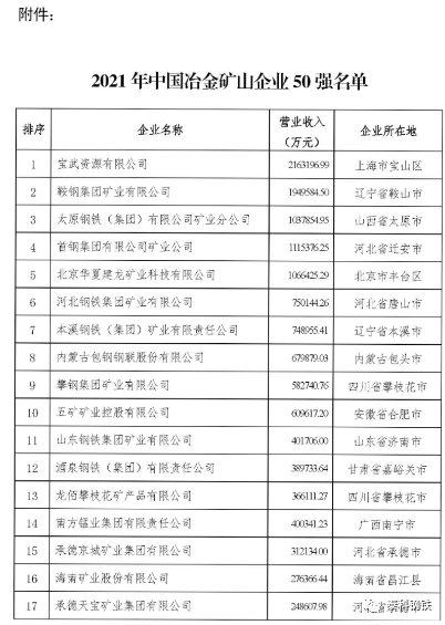 2021中国冶金矿山企业50强排行榜!宝武资源、鞍钢矿业、太钢矿业、首钢矿业、建龙矿业...