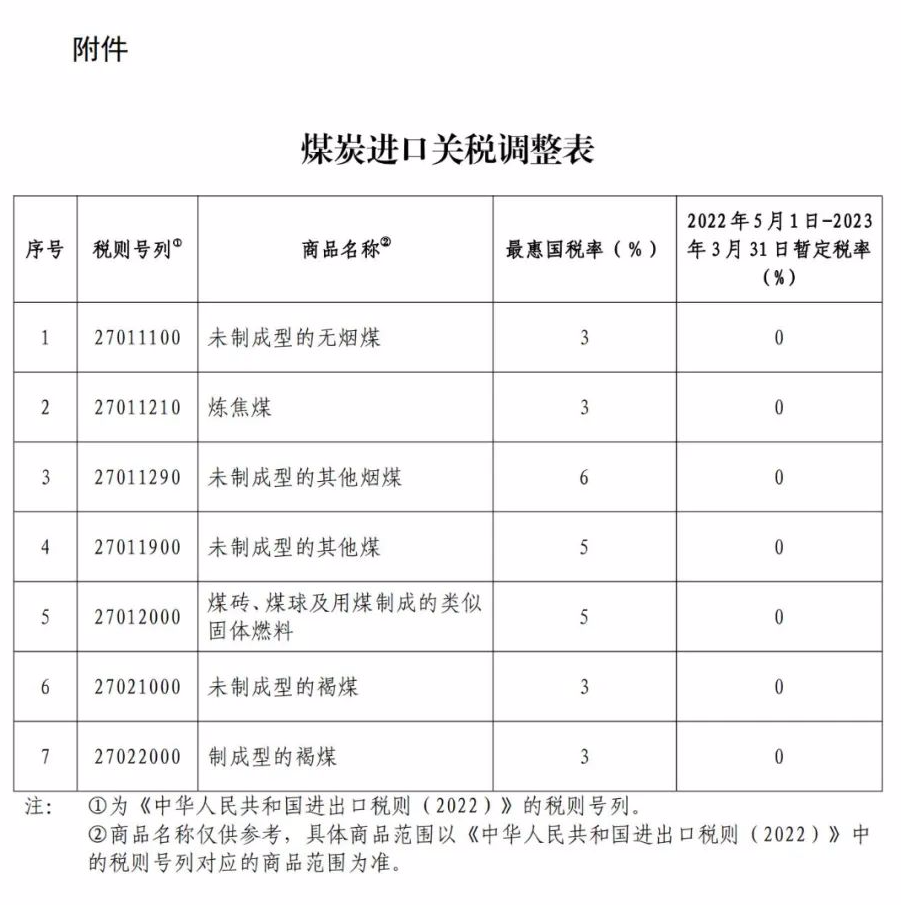 为加强能源供应保障,推进高质量发展,国务院关税税则委员会按程序决定,自2022年5月1日至2023年3月31日,对煤炭实施税率为零的进口暂定税率。