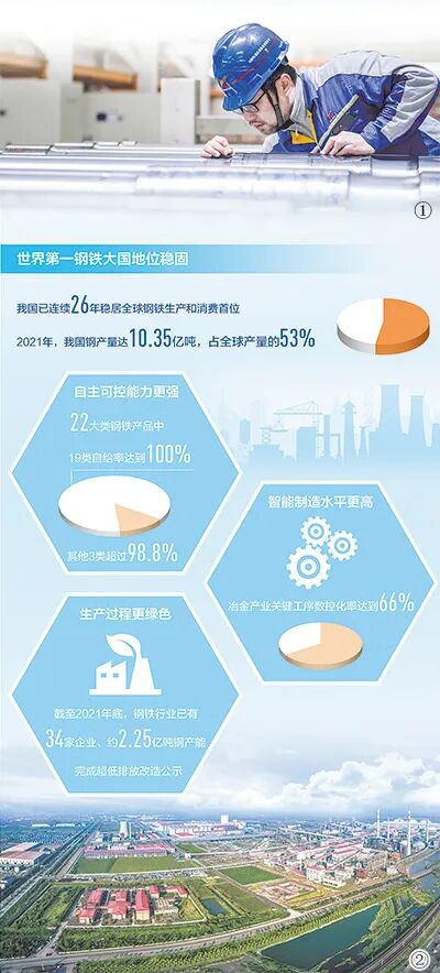 不变的是中国作为世界第一钢铁大国的稳固地位。自1996年钢产量突破1亿吨、跃居全球第一以来,我国已连续26年稳居全球钢铁生产和消费首位。去年,我国钢产量达10.35亿吨,占全球产量的53%。